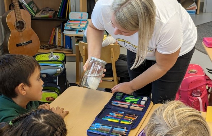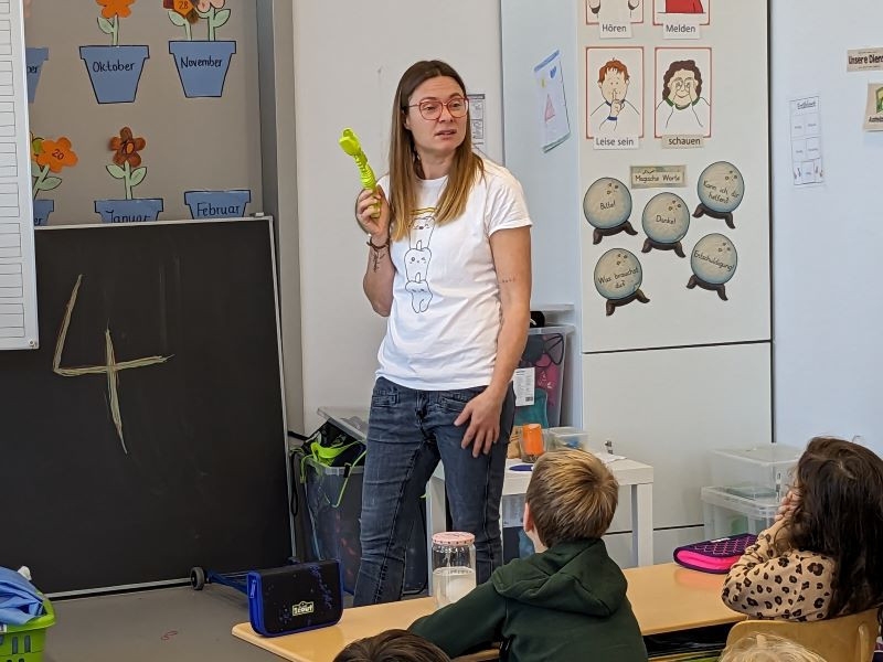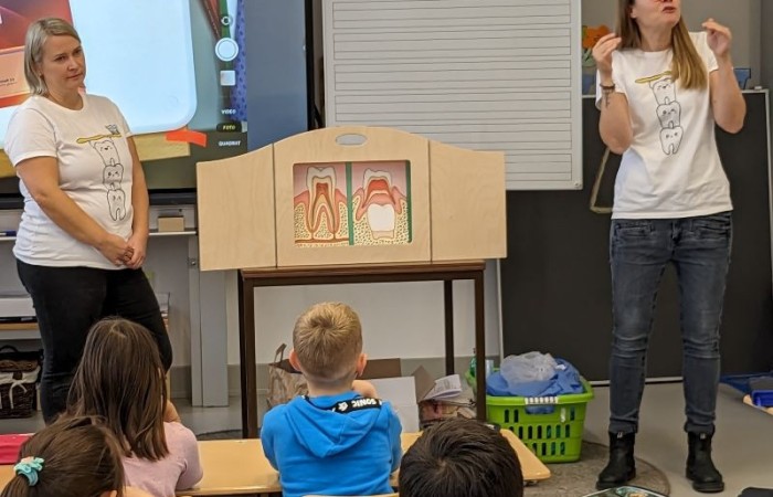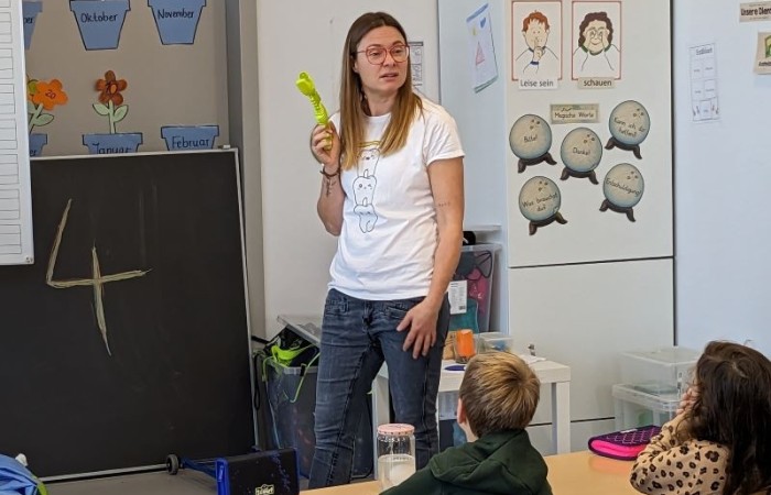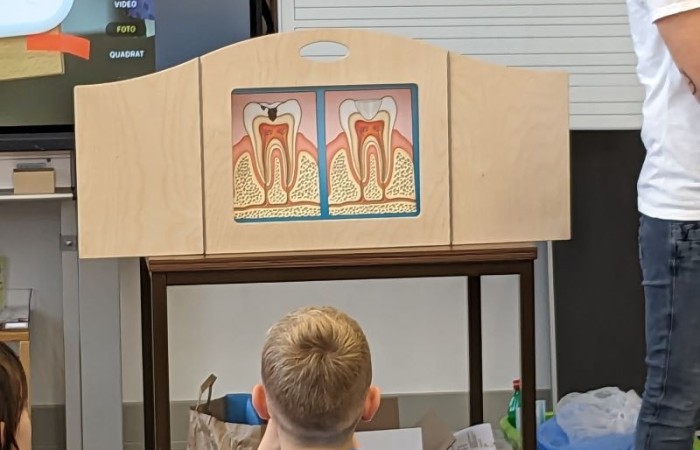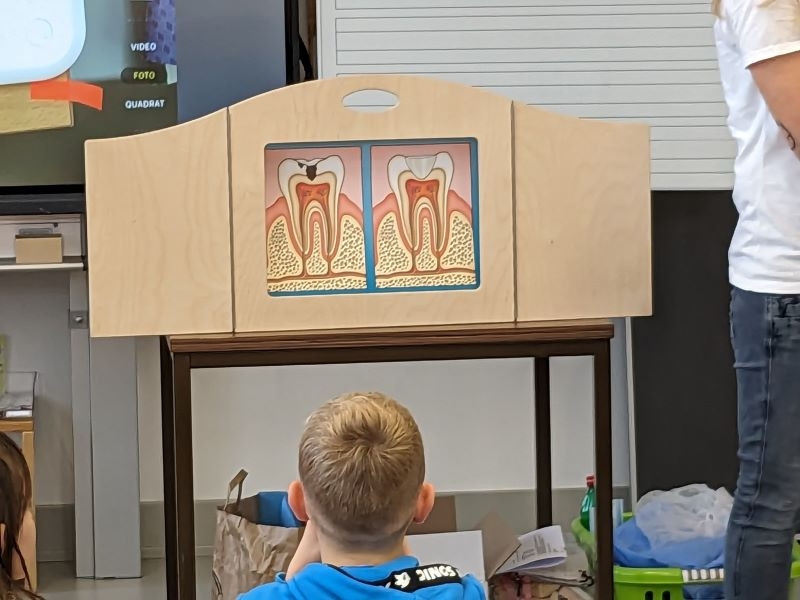 Sie hat uns anhand einer Geschichte erklärt, wie und wie oft wir Zähne putzen sollen und was wir dabei beachten müssen. Auch haben wir einige Experimente zu den Zähnen gemacht, die uns sehr beeindruckt haben. Ab jetzt putzen wir bestimmt immer ordentlich unsere Zähne!
