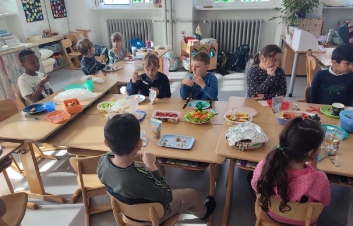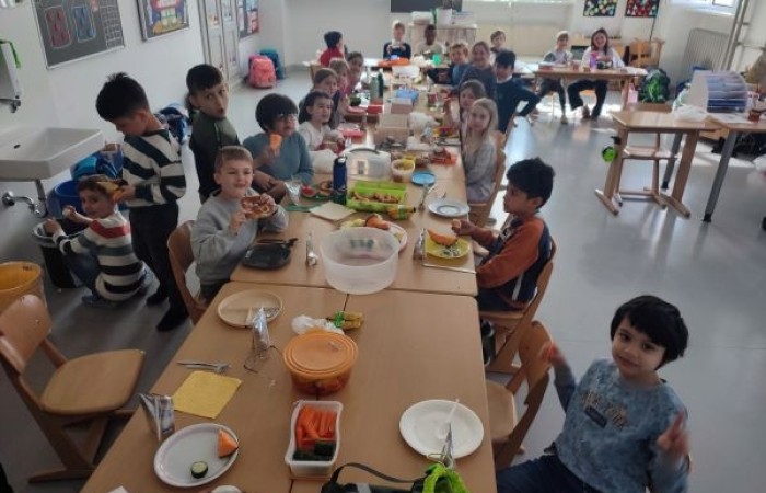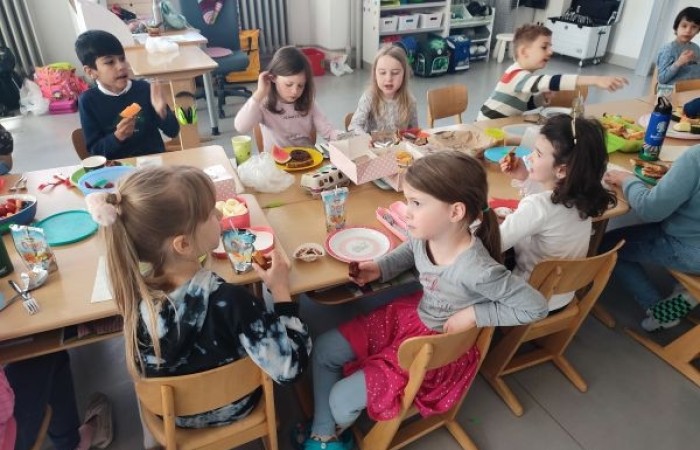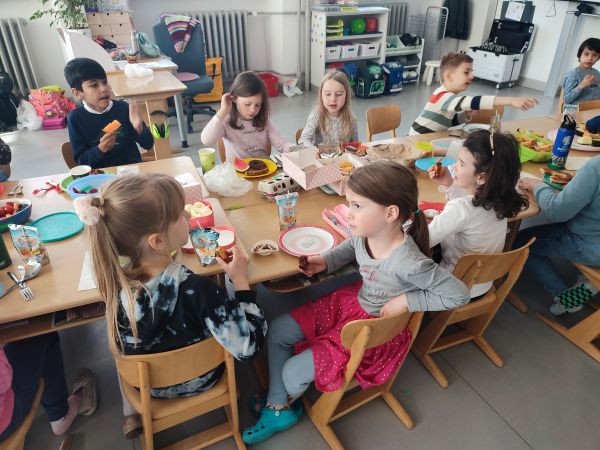 Nach dem Besprechen der Tischregeln halfen alle mit, aus den vielen kleinen Tischen eine lange Tafel zu machen. Gemeinsam deckten wir den Tisch und jedes Kind durfte erzählen, was es von zuhause mitgebracht hatte. Dann ließen wir uns die Köstlichkeiten schmecken. Vielen Dank an alle Eltern, die das möglich gemacht haben!