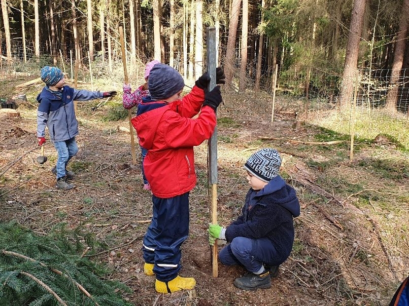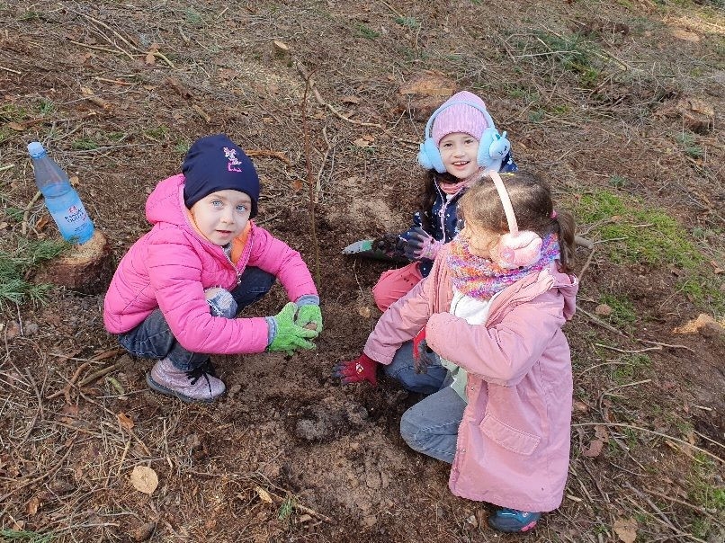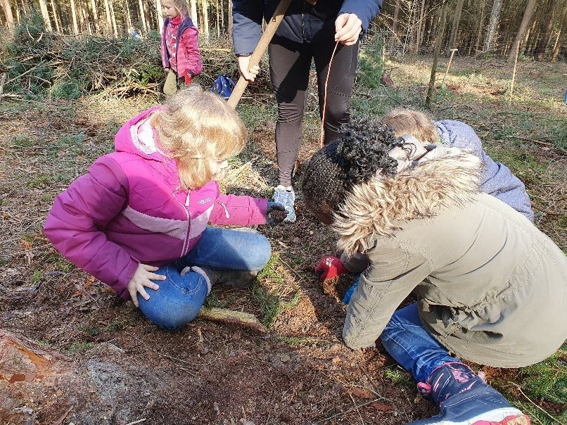 Dort empfing uns Förster Käßer und erklärte das Vorgehen und die Besonderheiten beim Baum pflanzen. Eifrig machten sich alle ans Werk und pflanzten verschiedene heimische Baumarten, um den Erhalt des Waldes zu unterstützen und somit einen Beitrag zum Umweltschutz zu leisten. Jede Gruppe hatte abschließend ein eigenes Bäumchen gepflanzt und mit einem Namensschild versehen, sodass sich das eigene Bäumchen bei einem Besuch im Wald schnell wiederfinden lässt.