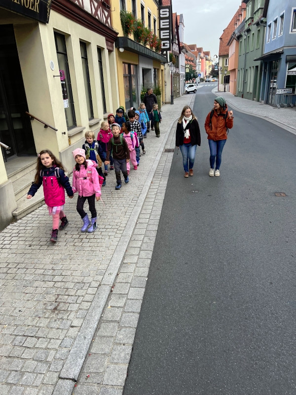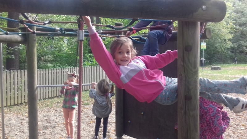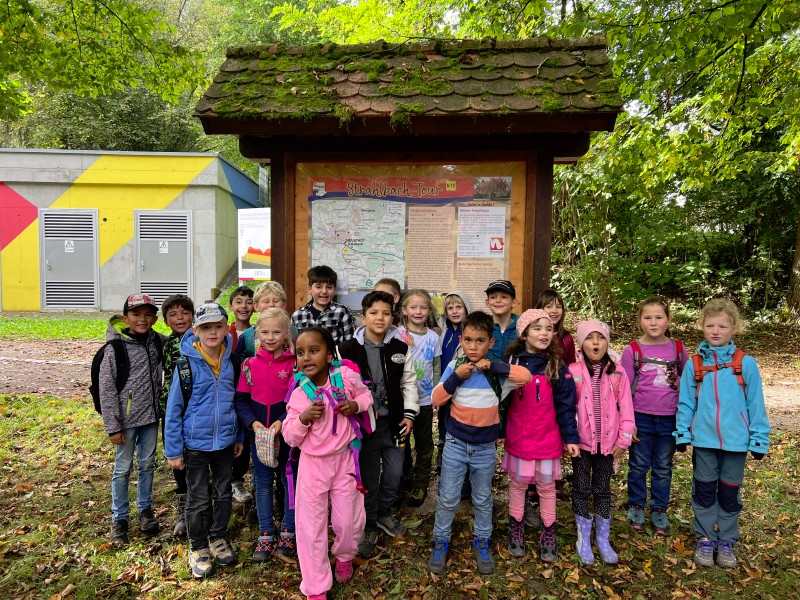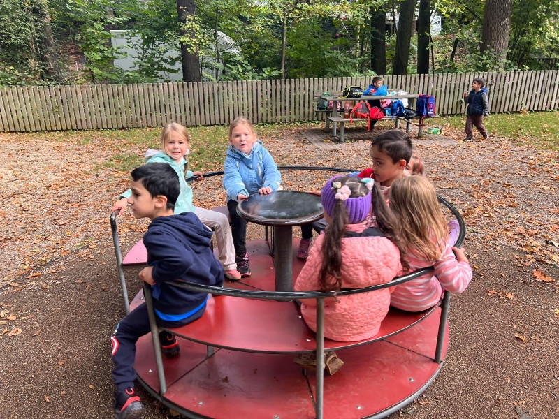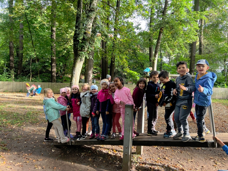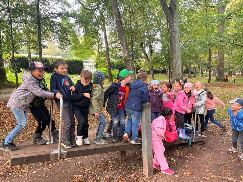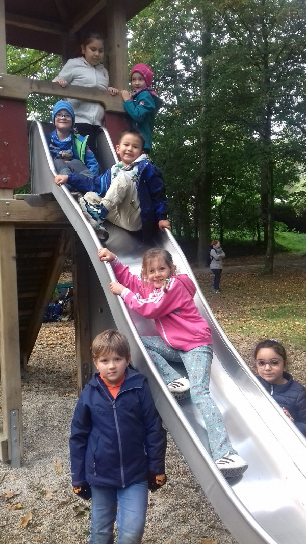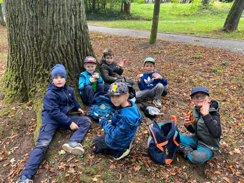 Zwar hatten wir nur wenig Sonnenschein, dafür ist es aber zumindest trocken geblieben. Bei unserem ersten Halt im Wald sind wir viel herum geklettert und haben bunte Blätter, Moos und allerlei andere herbstliche Naturschätze gefunden. Anschließend hatten wir noch viel Spaß auf dem großen Spielplatz mit Schaukeln, Wippen und dem Karussell. Nach einigen Gruppenfotos ging es dann auch schon wieder zurück zur Schule.