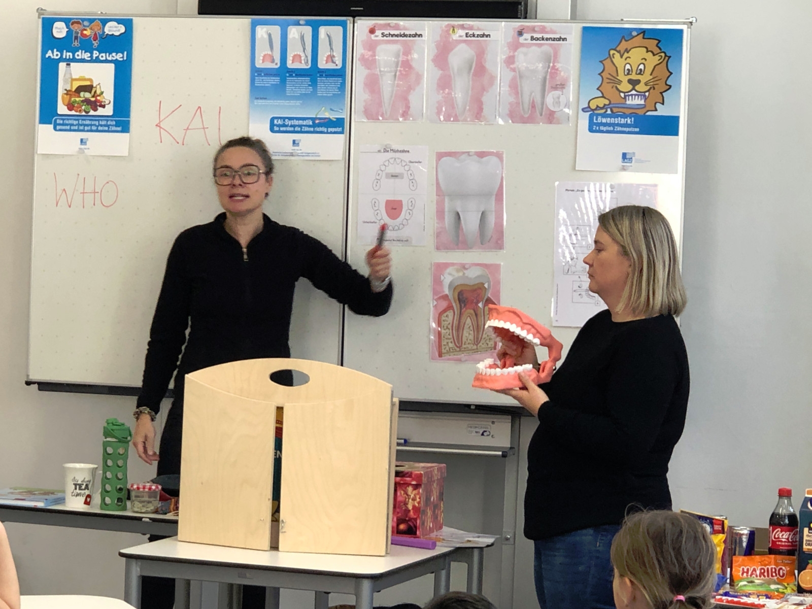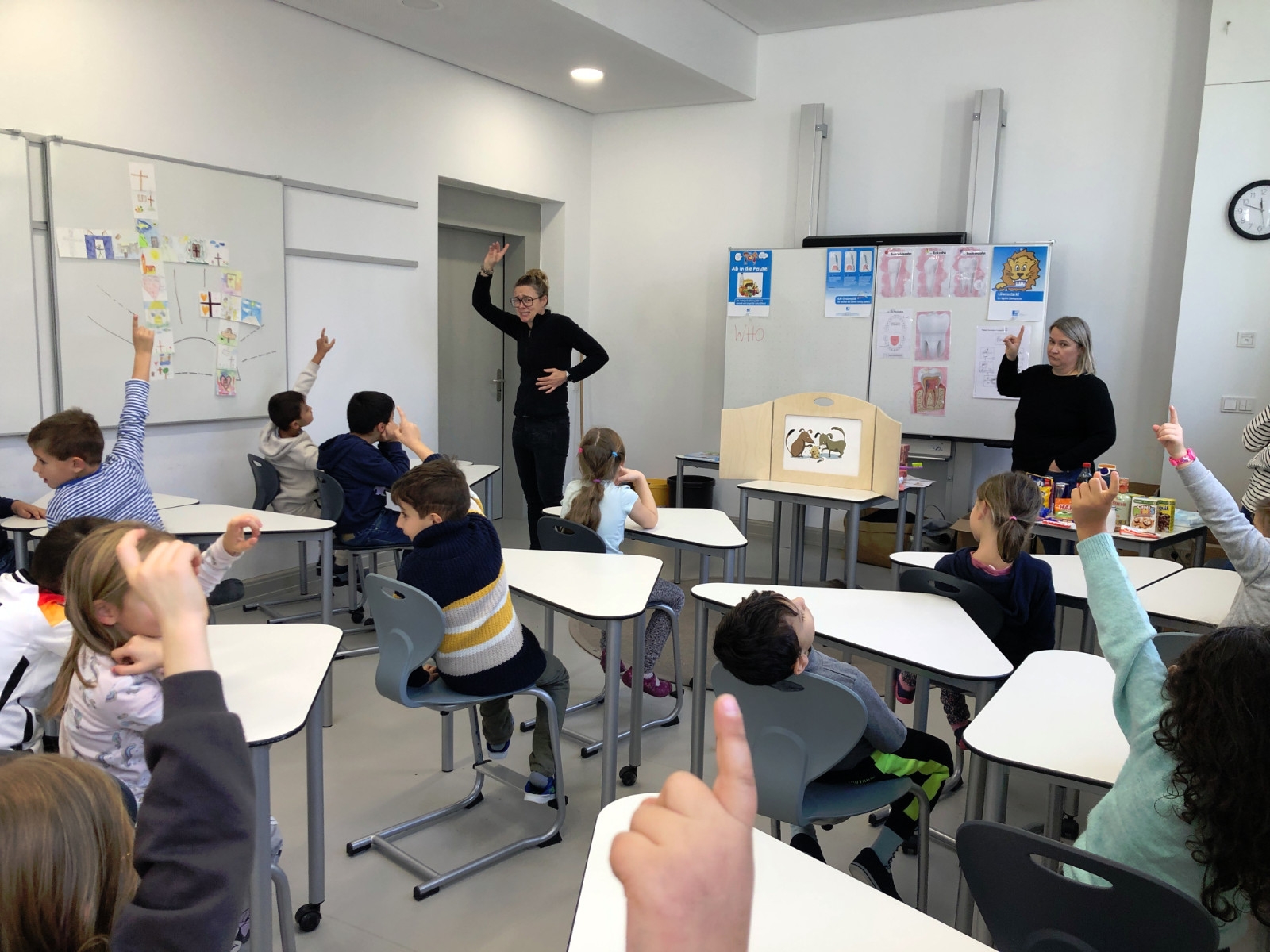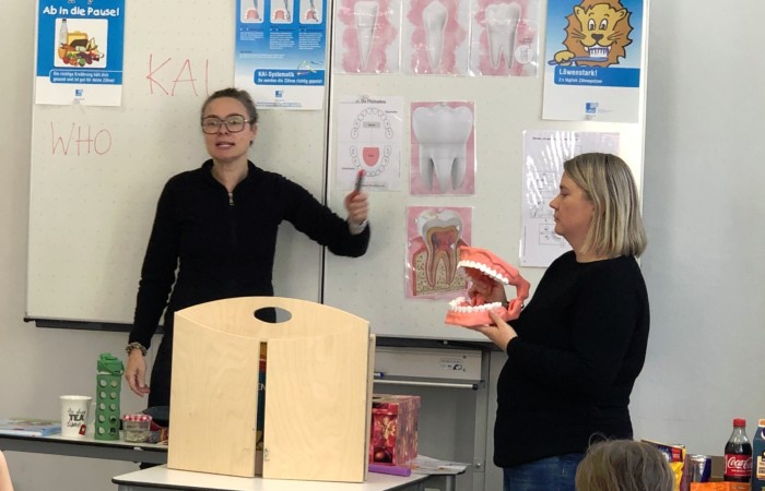 Gewohnt unterhaltsam und anschaulich brachten Hanka Herdoldt und ihre Assistentin Renate den Schülern der Klasse 1c nahe, warum und wie man die Zähne putzen muss.