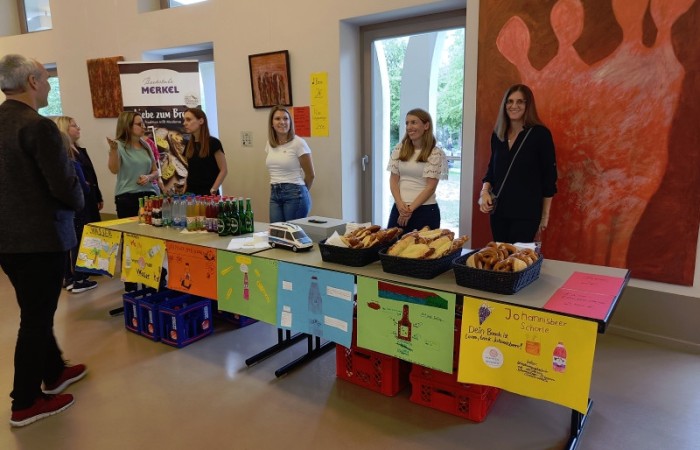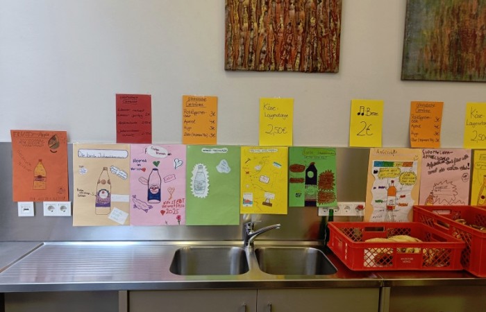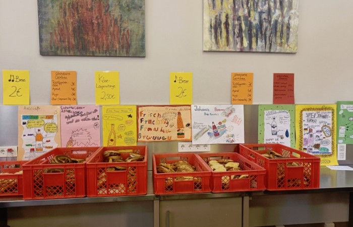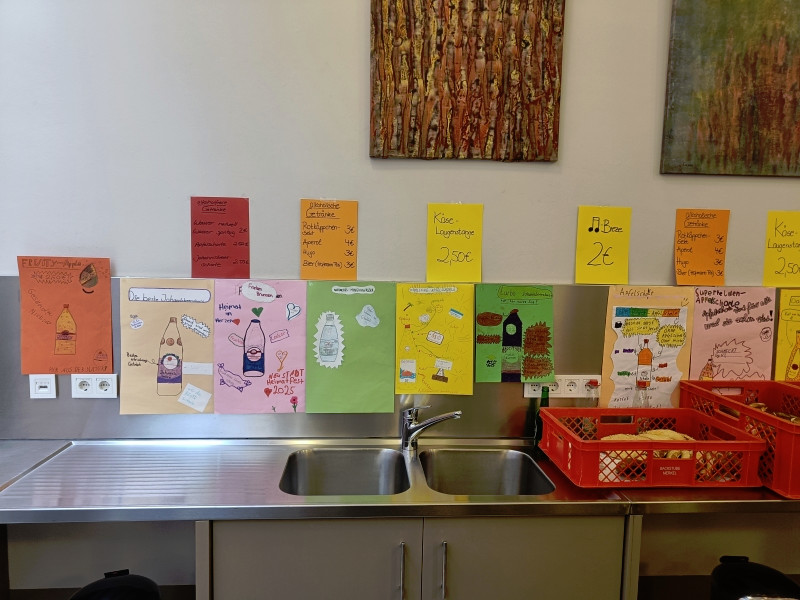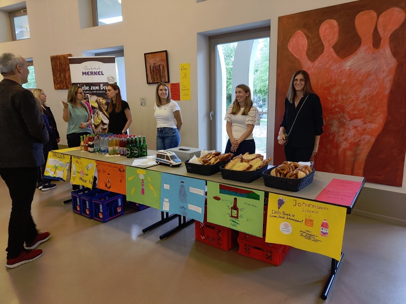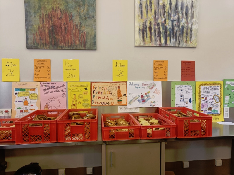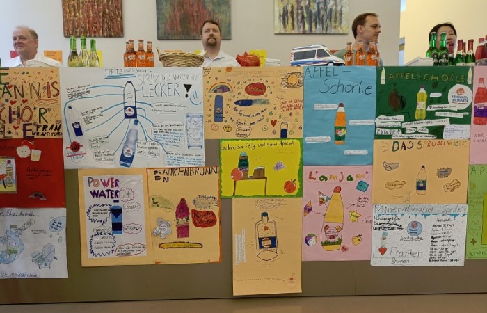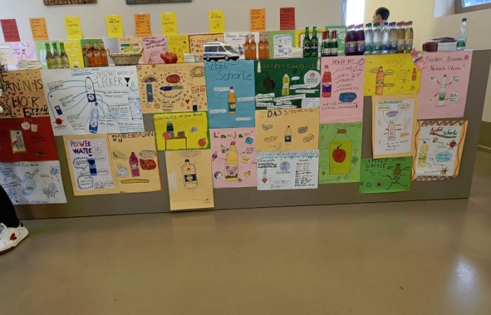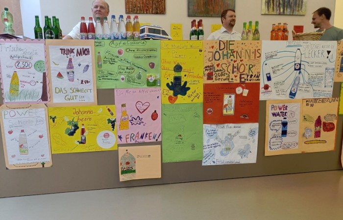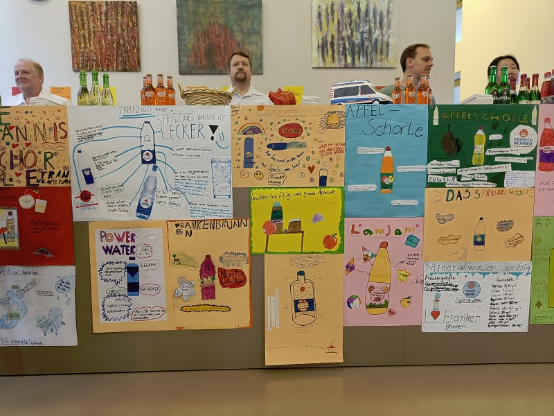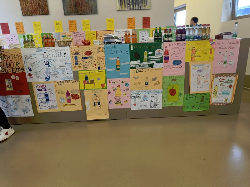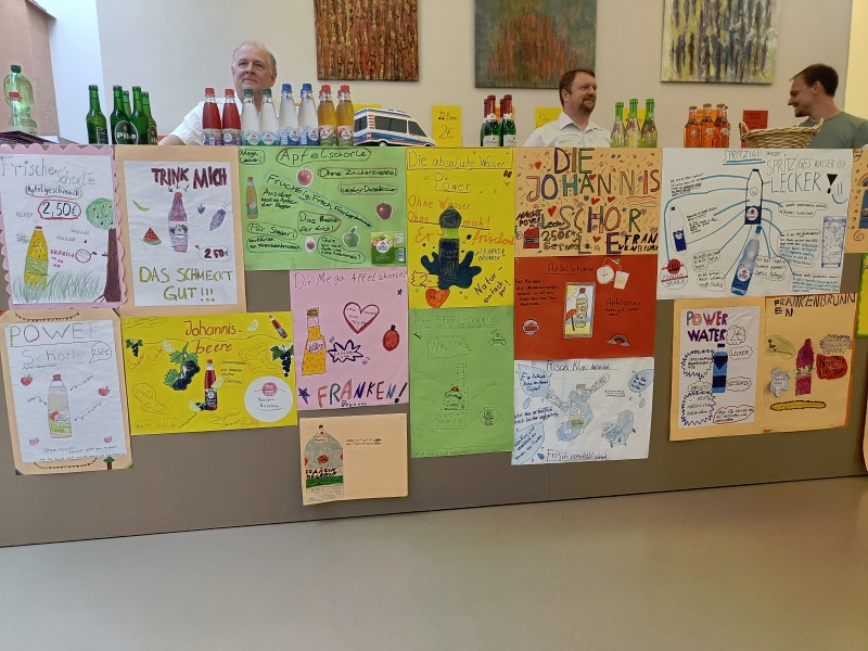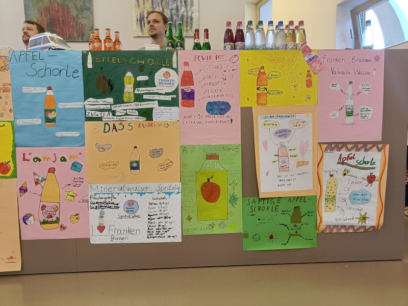 Zusätzlich waren im Foyer unsere Werbeplakate für die alkoholfreien Getränke der Firma FrankenBrunnen aufgehängt, die der Elternbeirat verkaufte. Die dritten und vierten Klassen entwarfen und gestalteten diese im Rahmen eines Werbe-Projekts.
