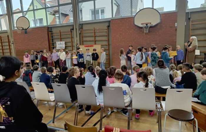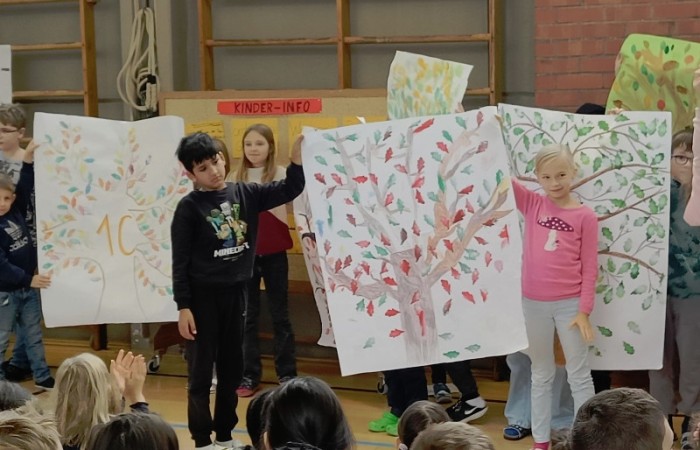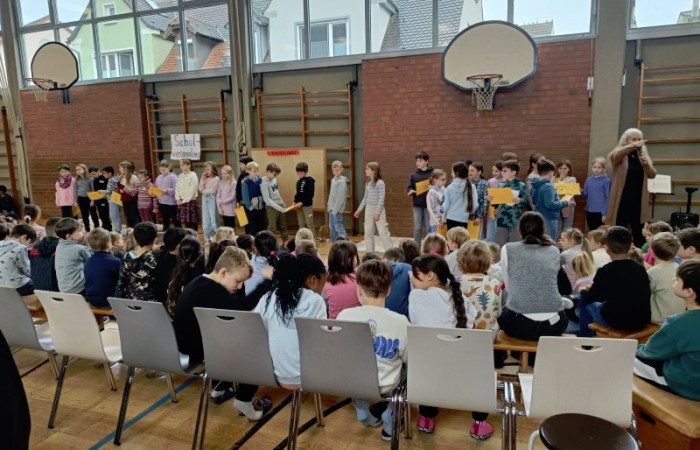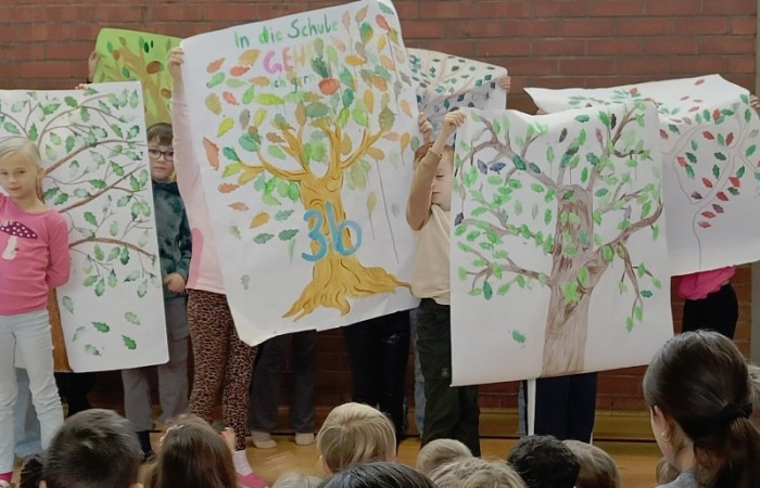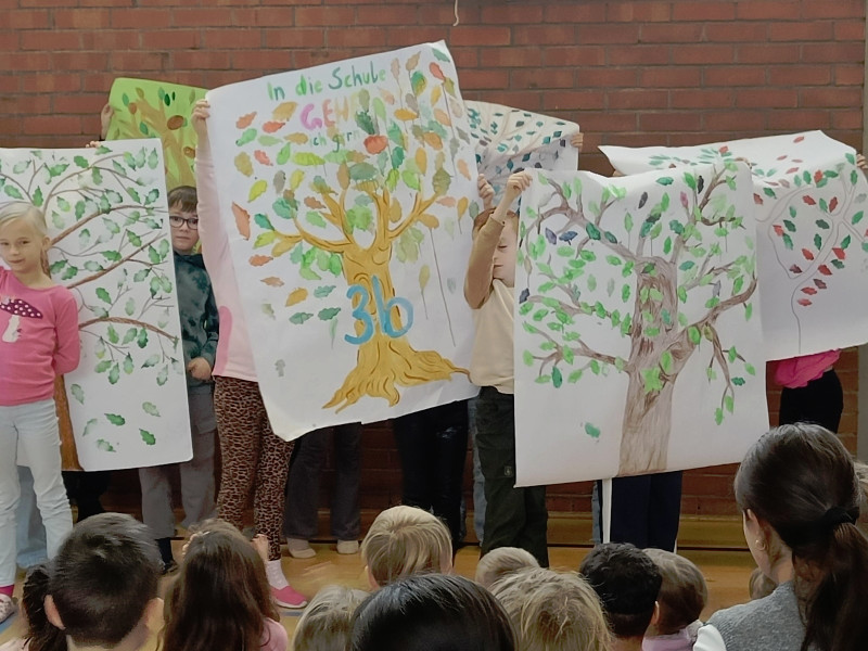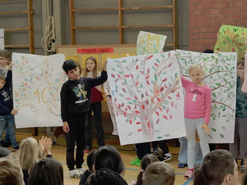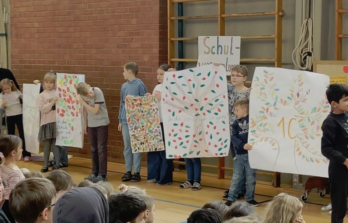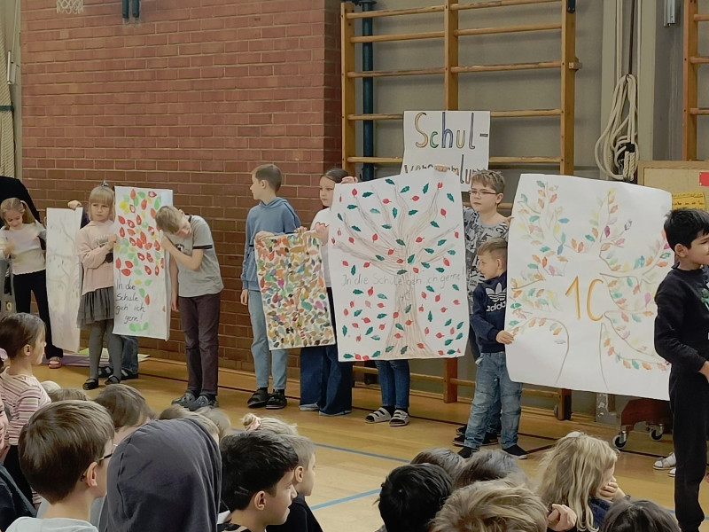 Zum Schluss führte die 4d ihren Freundschaftsrap vor und die Klassensprecher präsentierten die "Bäume" zum Projekt "In die Schule gehe ich gerne!".