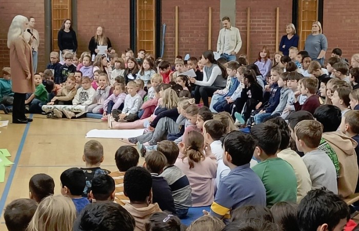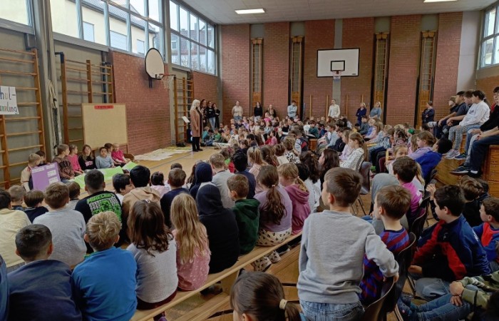 Alle Schüler begaben sich in der zweiten Stunde in die Turnhalle, um sich über ihre Schule viele Gedanken zu machen. Der Inhalt der Schulversammlung wurde von den zweiten Klassen mit Unterstützung durch Frau Röder moderiert.