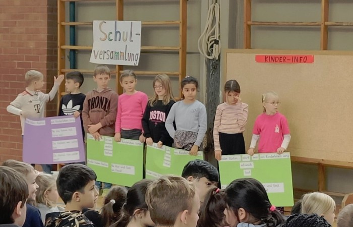 Zu Beginn sangen alle gemeinsam ein Lied zu den Kinderrechten: „Alle Kindern haben Rechte.“ Die zweiten Klassen hielten dazu den Text auf Plakaten hoch. Danach trug die dritte Klasse ihre Wünsche für eine gut gelingende Schule vor: