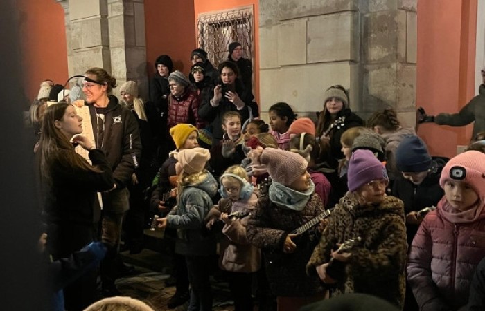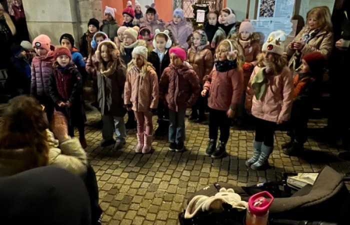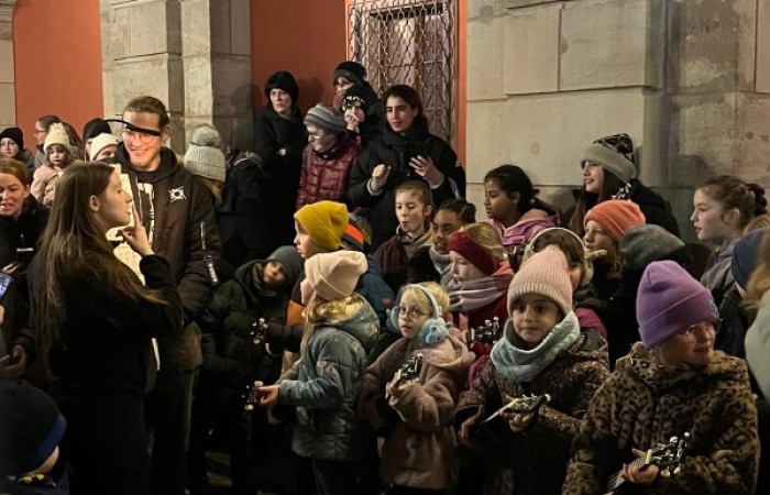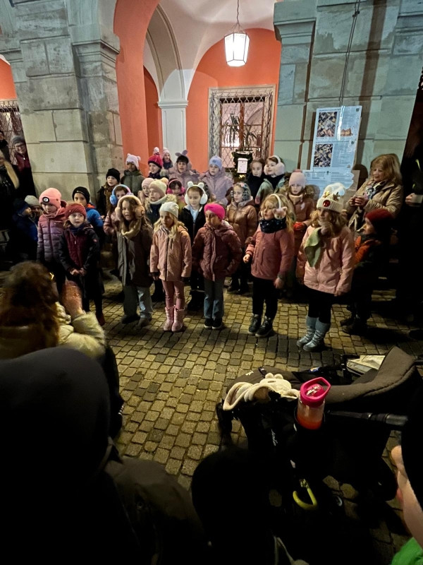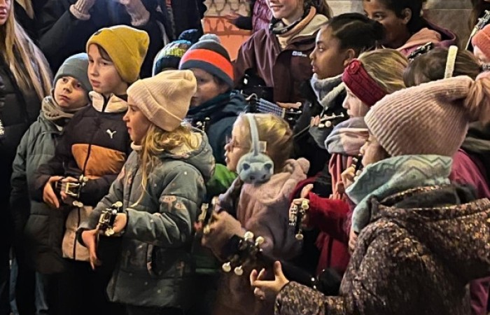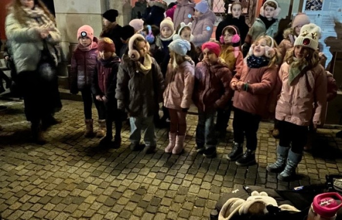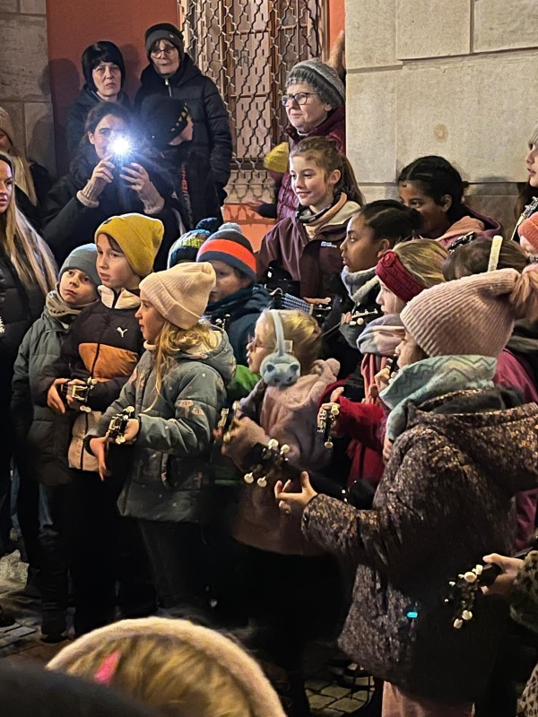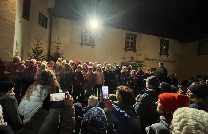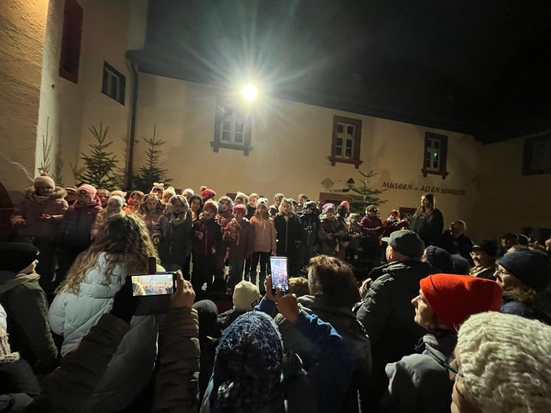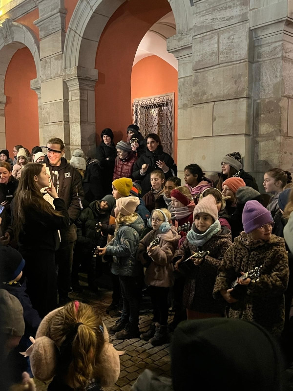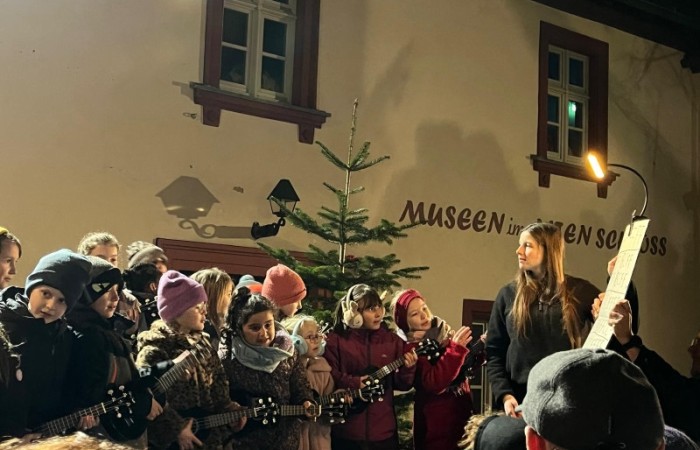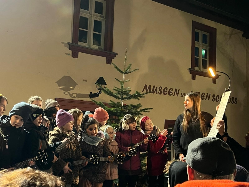 Das Lied "Kling Glöckchen klingelingeling" wurde mit passenden Bewegungen und klingenden Glöckchen dargeboten. Bei dem Lied "Fröhliche Weihnacht überall" begleitete die Ukulelen-AG die Sänger. Viel Applaus gab es für die schönen Auftritte am Marktplatz und im Schlosshof.