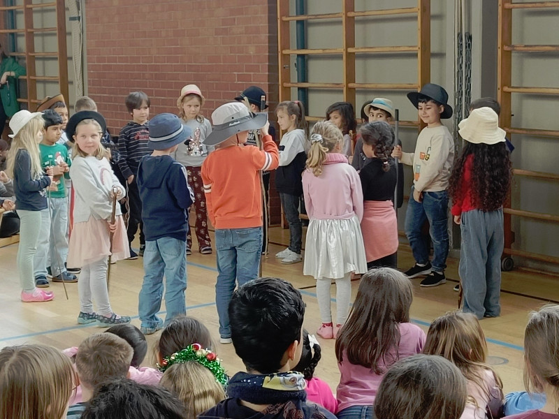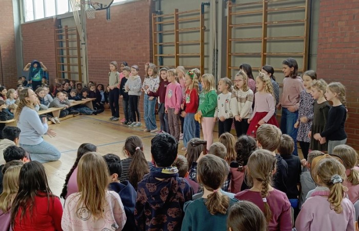 Stimmungsvoll begann sie mit dem gemeinsam gesungenen Lied „Wir sagen euch an den lieben Advent“. Danach wurde von der 4a das Lied" Sleigh Ride" als Cup-Song mit Plastikbechern begleitet. Der Chor und die Ukulelen-AG spielten "Kling Glöckchen klingelingeling" und "Fröhliche Weihnacht überall". Nach dem bolivianischen Hirtentanz der Klasse 1a wurde die besinnliche Stunde von allen Anwesenden mit dem gemeinsamen Lied „In der Weihnachtsbäckerei“ beendet.
