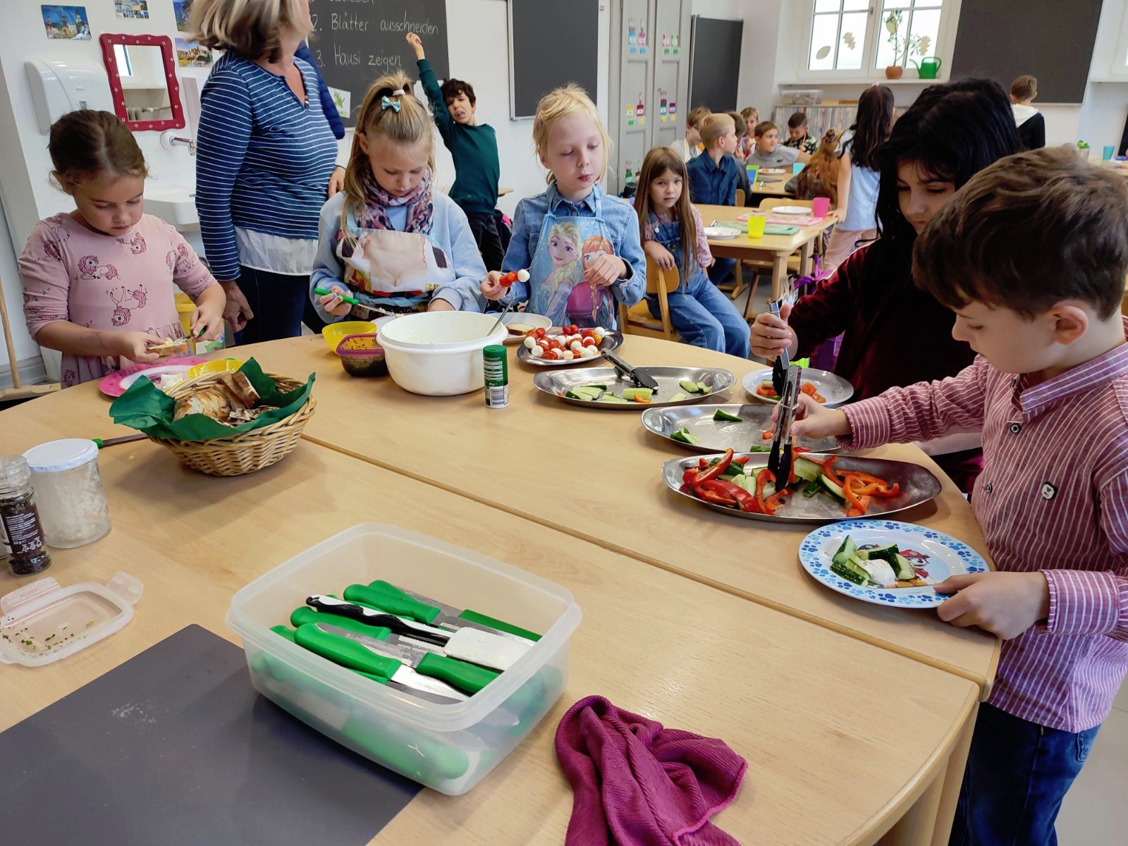 Es wurde geschüttelt, damit Butter entsteht, Gemüse in kleine Sticks geschnitten, Käse und Tomaten aufgespießt und eine große Schüssel Kräuterquark angerührt.