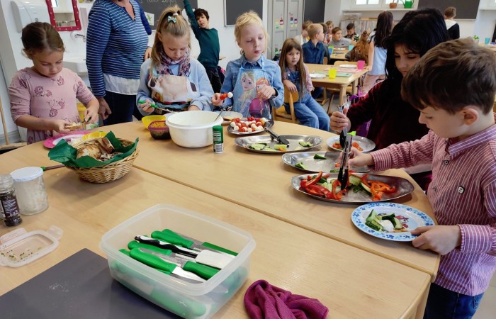 Anhand der Ernährungspyramide erklärte sie uns wie viel Milchprodukte am Tag gesund sind. Und die Kinder wissen nun auch wie die Milch aus der Kuh in die Milchprodukte gelangt. Außerdem brachte Frau Stadelmann viele Milchprodukte und Zutaten mit, die alle Kinder zu einem gesunden Buffet verarbeitet haben.