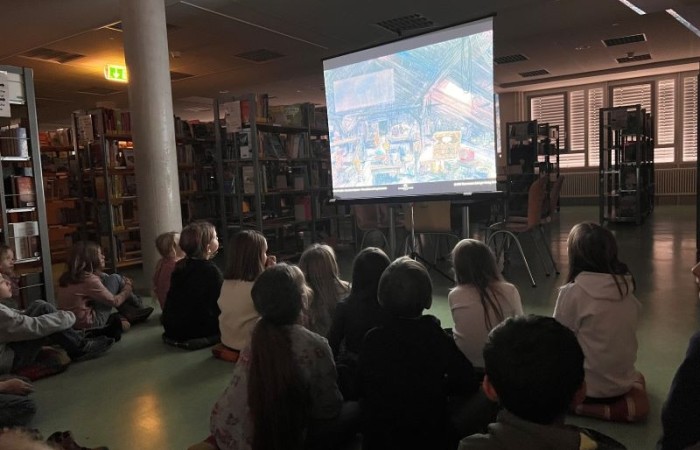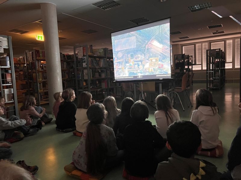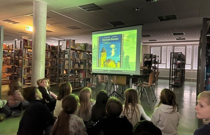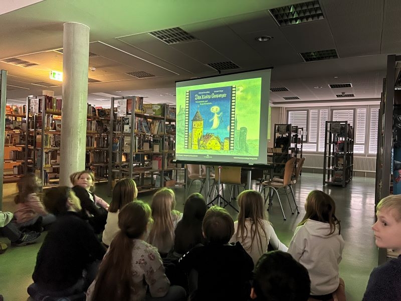 Heute war die Klasse 2c zu Gast in der Kreisbücherei, um ein besonderes Highlight zu erleben: das Bilderbuchkino „Das kleine Gespenst“.