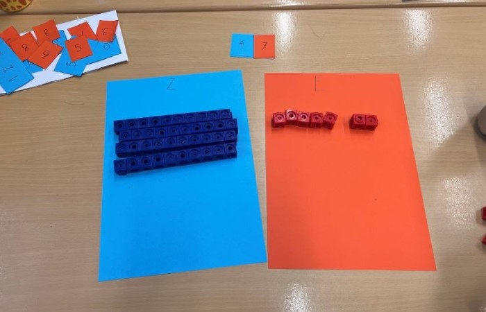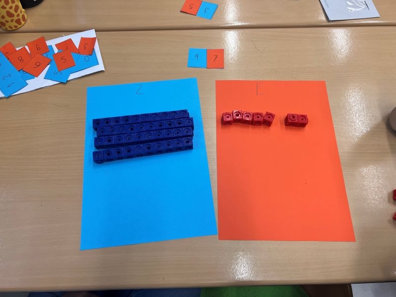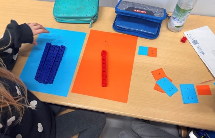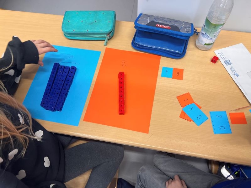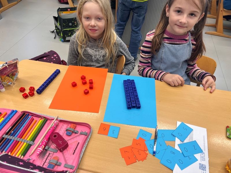 Mithilfe von Steckwürfeln konnten die Kinder auf anschauliche Weise erkennen, wie Zahlen aufgebaut sind. Jede Zehner- und Einerstelle wurde durch passende Steckwürfel dargestellt, wodurch die Schüler schnell den Zusammenhang zwischen der Anzahl der Würfel und dem Wert der Stelle verstanden. So wurden Zehner und Einer visualisiert und erlebbar gemacht.
