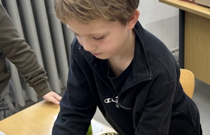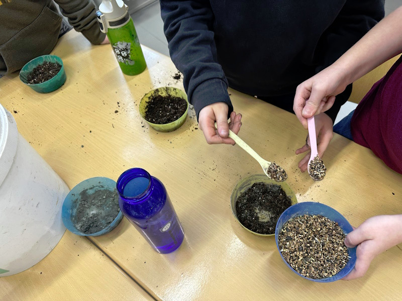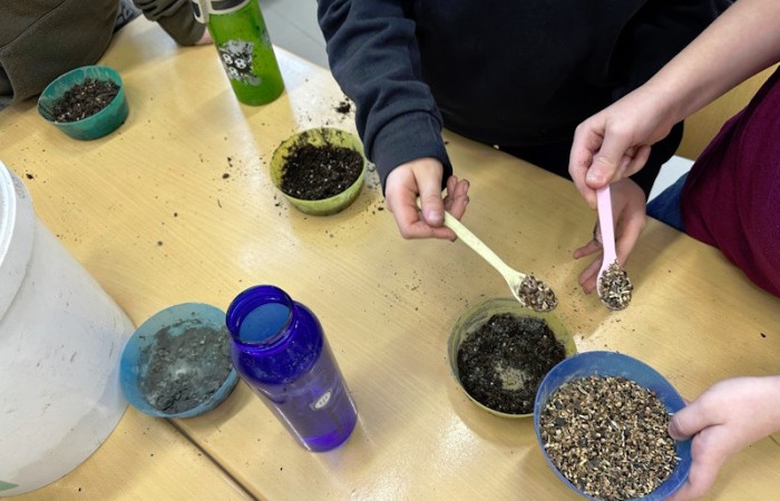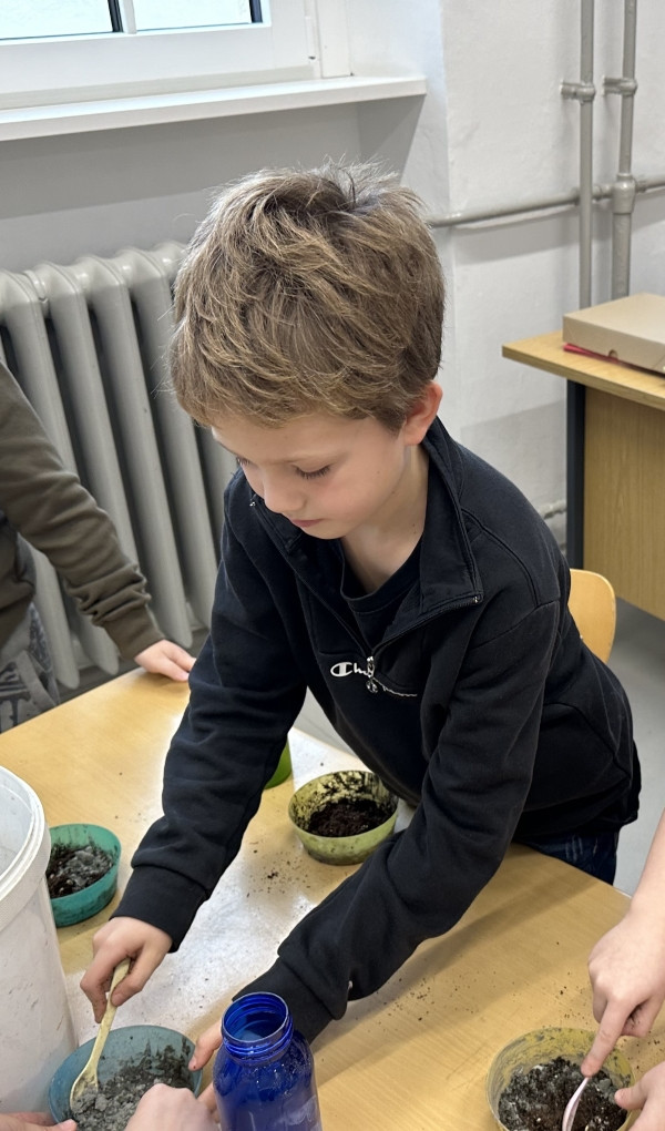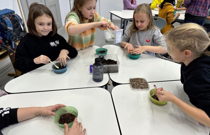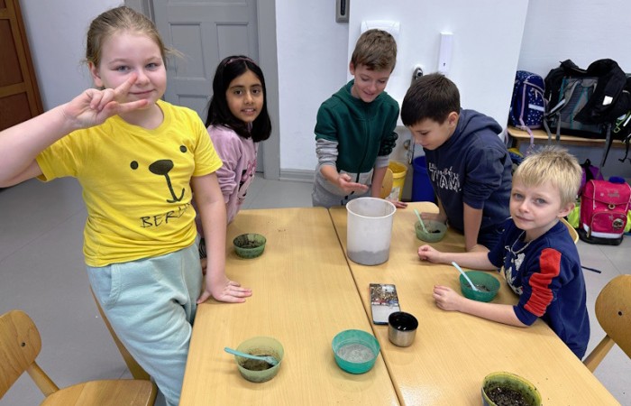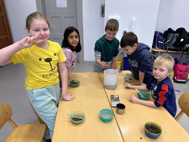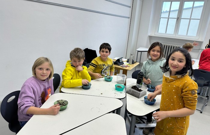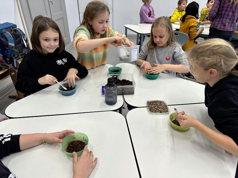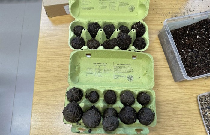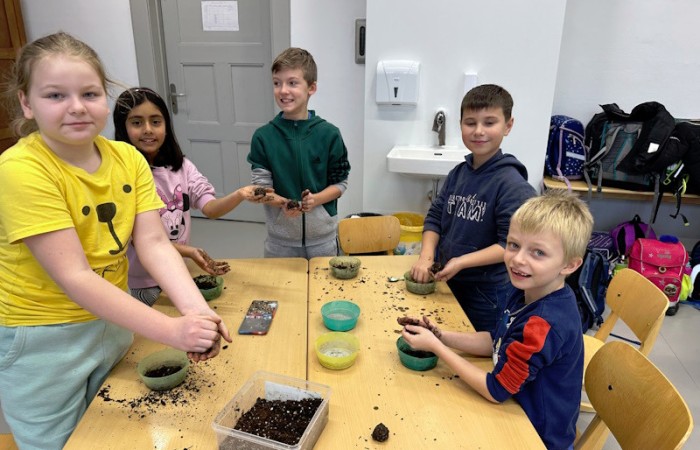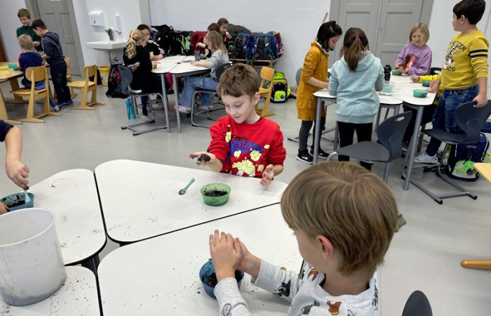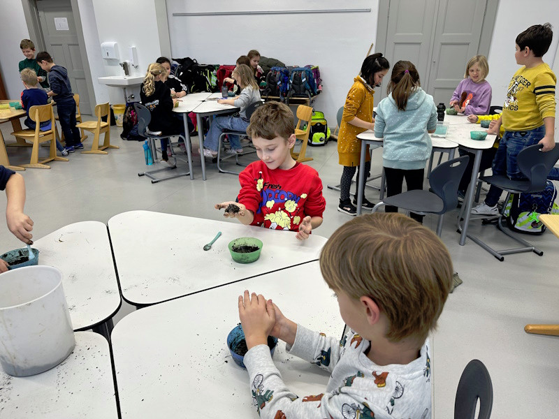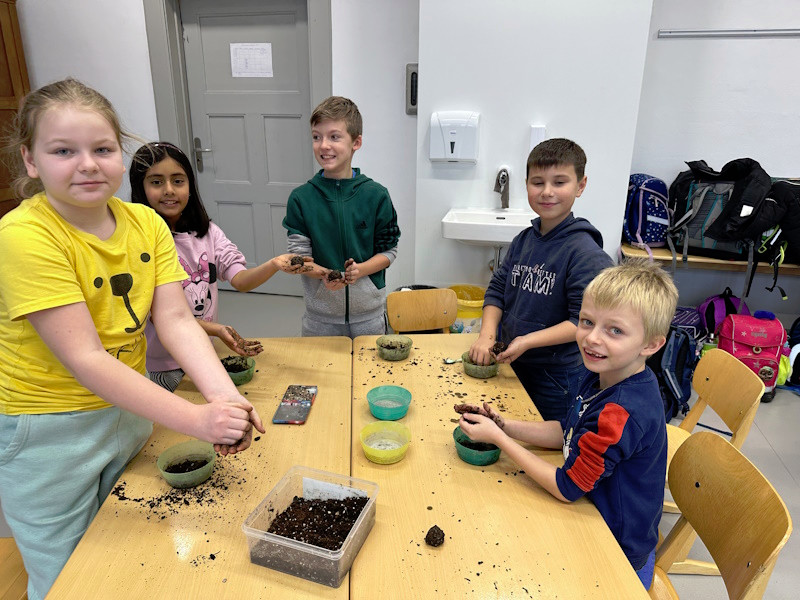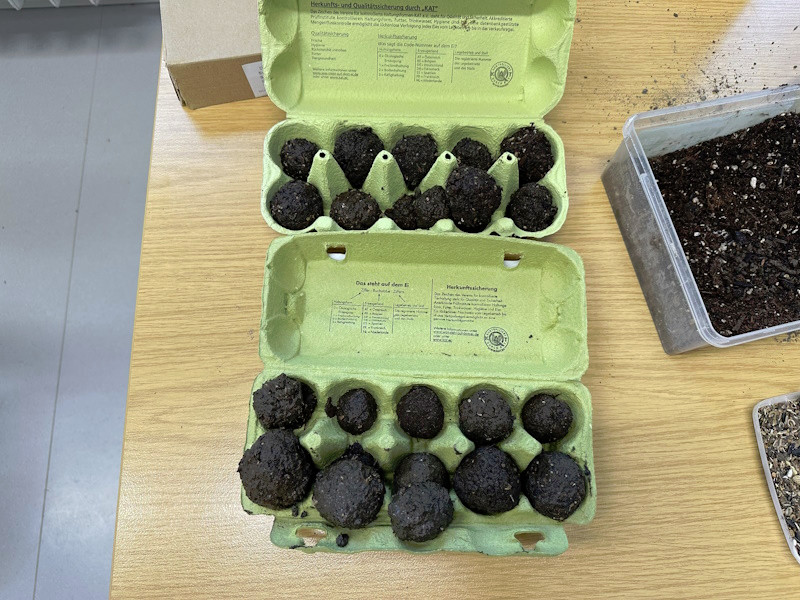 Zum Schluss wurde es praktisch. Die Schüler und Schülerinnen der 3a stellten Samenbomben her, die bis zum Frühjahr in einem Eierkarton zum Trocknen verbleiben.