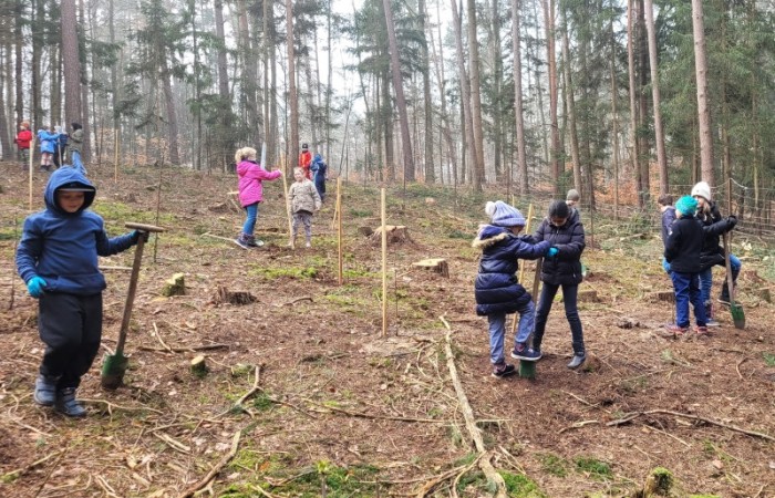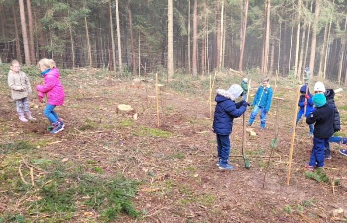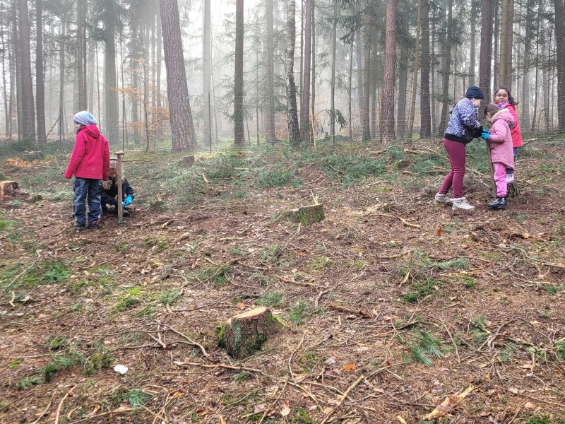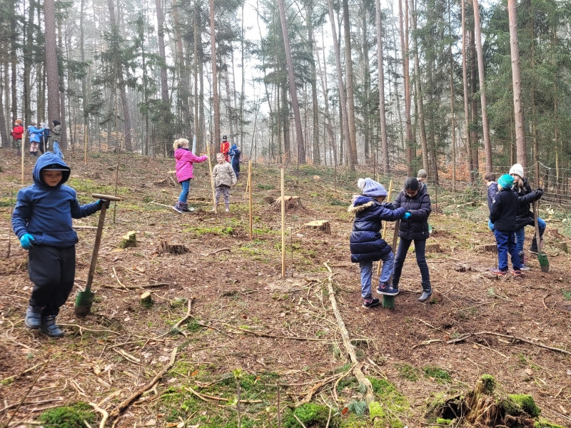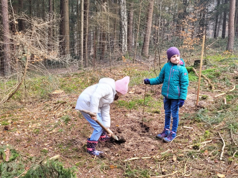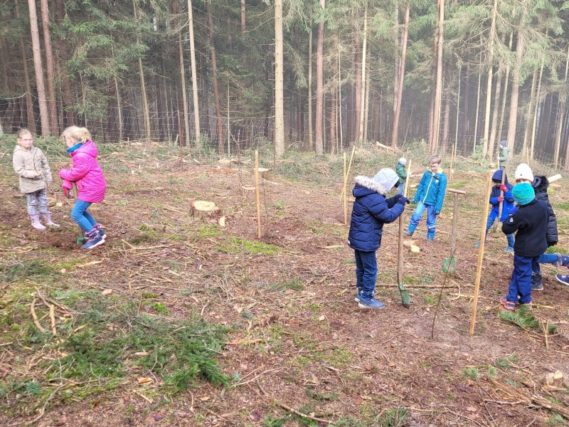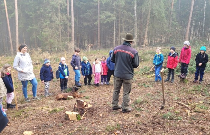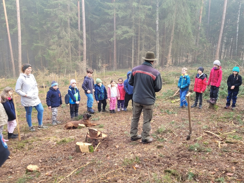 Bei gutem Wetter trafen wir uns dort mit dem Förster Käßer und seinem Hund Fritzi. Als erstes machten wir eine Brotzeitpause, um dann gestärkt einen Spitzahorn zu pflanzen. Wir suchten einen geeigneten Standort, entfernten Laub und Moose und gruben mit dem Spaten ein so tiefes Loch, dass die Wurzeln gut hineinpassten. Nach dem erfolgreichen Einpflanzen durfte jedes Pflanzduo seinen Baum mit einem Stock versehen, auf dem die Namen der Kinder zu lesen sind. So können wir im nächsten Jahr beobachten, wie groß unsere Bäumchen geworden sind.