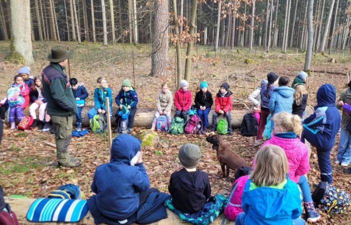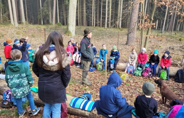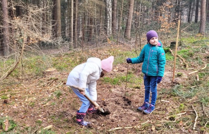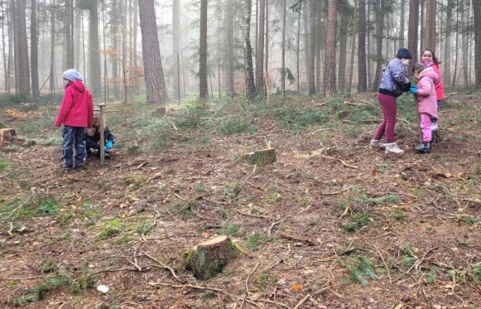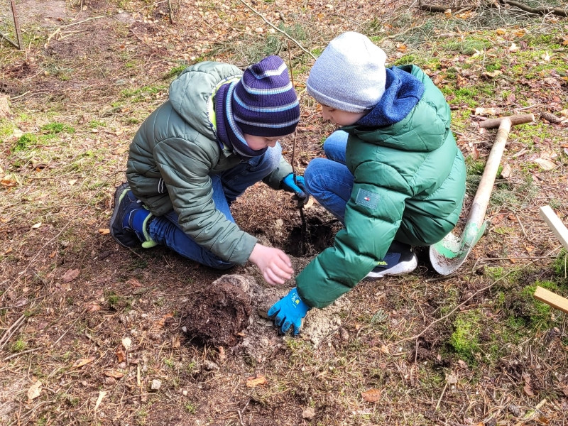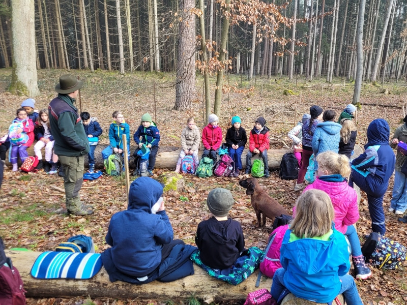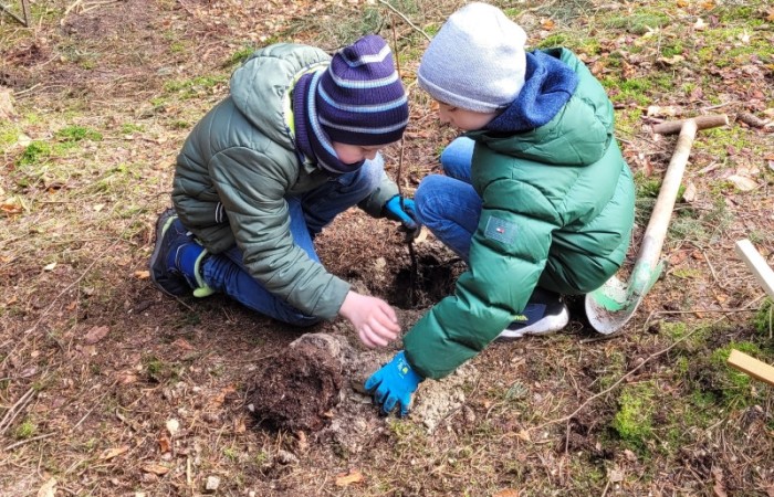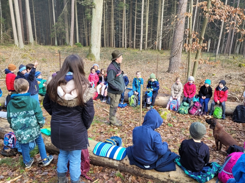 Bei gutem Wetter trafen wir uns dort mit dem Förster Käßer und seinem Hund Fritzi. Als erstes machten wir eine Brotzeitpause, um dann gestärkt einen Spitzahorn zu pflanzen. Wir suchten einen geeigneten Standort, entfernten Laub und Moose und gruben mit dem Spaten ein so tiefes Loch, dass die Wurzeln gut hineinpassten. Nach dem erfolgreichen Einpflanzen durfte jedes Pflanzduo seinen Baum mit einem Stock versehen, auf dem die Namen der Kinder zu lesen sind. So können wir im nächsten Jahr beobachten, wie groß unsere Bäumchen geworden sind.
