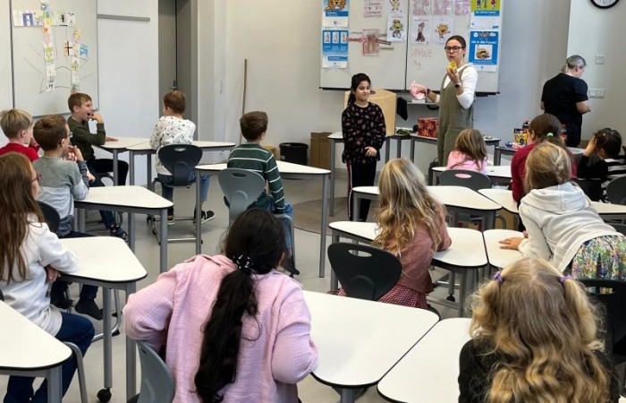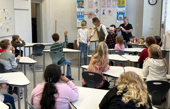 Ein weiteres wichtiges Thema war die Ernährung und wie sie unsere Zahngesundheit beeinflusst. Besonders spannend war, als die Zahnärztin zeigte, wie viel Zucker in verschiedenen Lebensmitteln und Getränken steckt. Toll war das Spiel, das die Zahnärztin dafür dabeihatte. Wir durften erst selbst raten, wie viel Zucker wohl in den Lebensmitteln steckt, bevor es aufgelöst wurde. Es war überraschend, wie viel Zucker wir manchmal unbewusst zu uns nehmen!