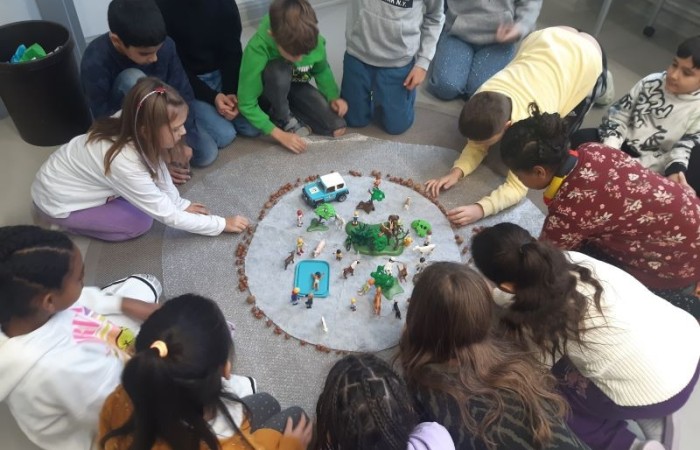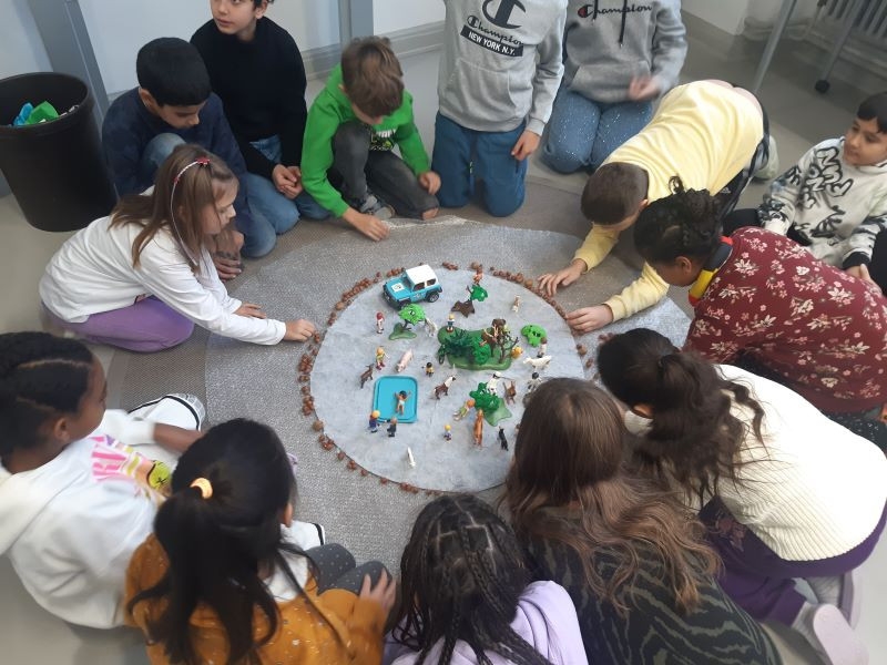 Um den Treibhauseffekt besser zu verstehen, gestalteten die Kinder ein Bodenbild. Das Bodenbild sah so aus: Die Erde war ein kleiner, runder Teppich, um den eine Luftpolsterfolie als Atmosphäre gelegt wurde. Dabei legten die Kinder Nüsse symbolisch um die Erde, die die CO₂-Teilchen darstellten, welche die Atmosphäre belasten und den Klimawandel vorantreiben. Diese bildliche Darstellung machte den komplexen Zusammenhang für die Schülerinnen und Schüler greifbar.