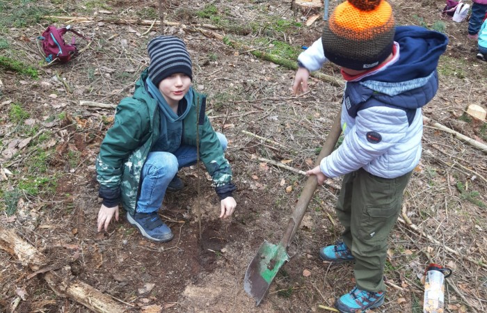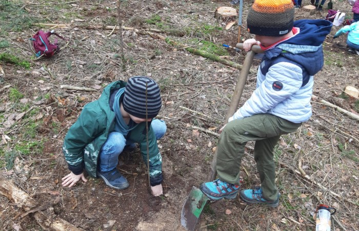Im Schulwald angekommen gab es nach dem anstrengenden Marsch erst mal eine kleine Brotzeitpause zur Stärkung. Anschließend machten sich die kleinen Naturfreunde mit vereinten Kräften und unter der fachkundigen Anleitung von Förster Herr Käßer ans Werk. Sommerlinde und Spitzahorn fanden so ihren Platz in der Erde, während die Kinder voller Eifer den Anweisungen des Försters folgten. Herr Käßer nahm sich die Zeit, den neugierigen Kindern die Abläufe beim Baumpflanzen genau zu erklären und beantwortete geduldig all ihre Fragen.