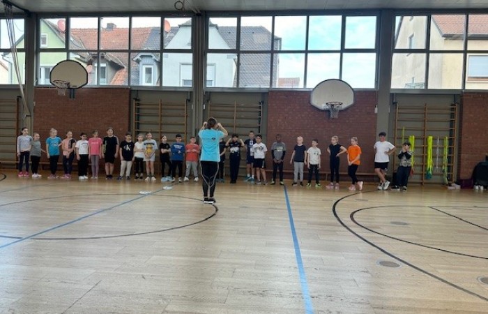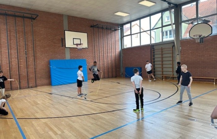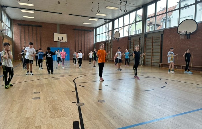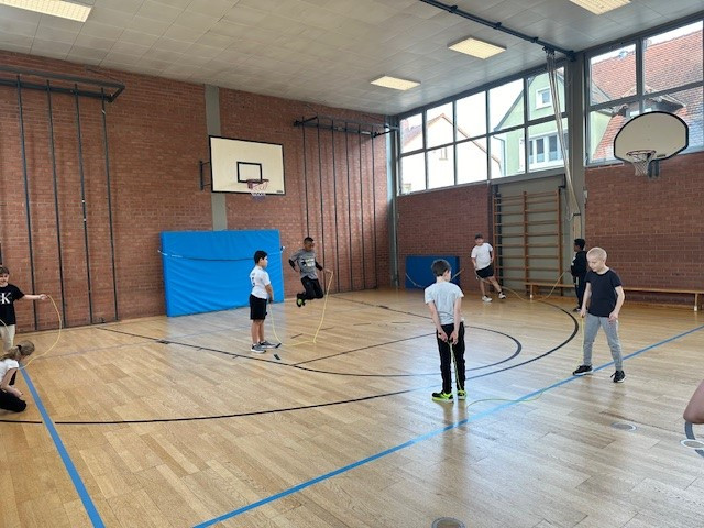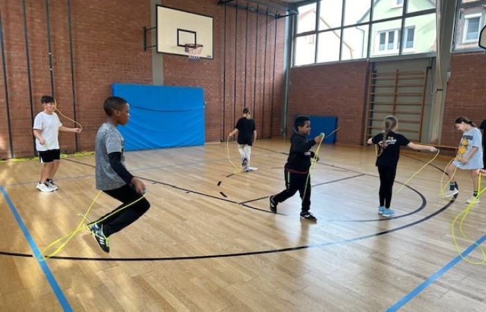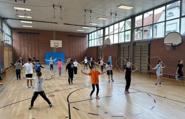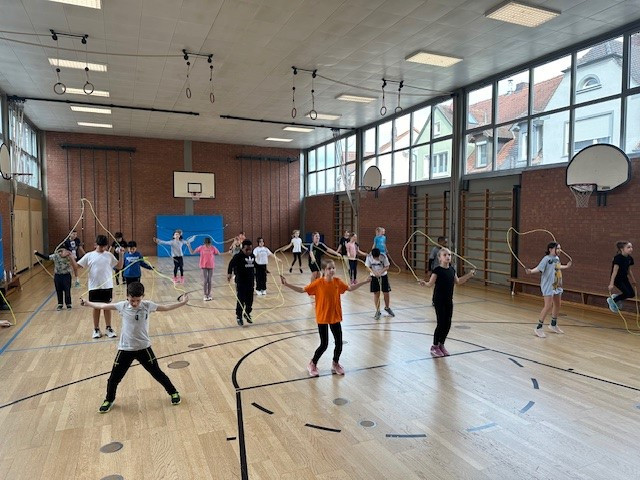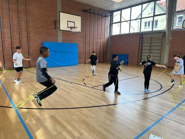 „Skipping Hearts“ hat zum Ziel, die Freude an Bewegung zu fördern und konditionelle sowie koordinative Fähigkeiten zu verbessern. In diesem Basiskurs wurden unseren Schülerinnen und Schülern, in Begleitung von flotter Musik, die Grundlagen der Sportart Rope Skipping, also dem sportlichen Seilspringen, vermittelt. Unsere Workshop-Leiterin hat damit und mit ihrer motivierenden und fröhlichen Art die Herzen der Kinder erobert. Ob allein, zu zweit oder mit der ganzen Klasse am Long Rope (langes Seil), viele Sprungkombinationen waren mit den Mitschülerinnen und Mitschülern möglich.