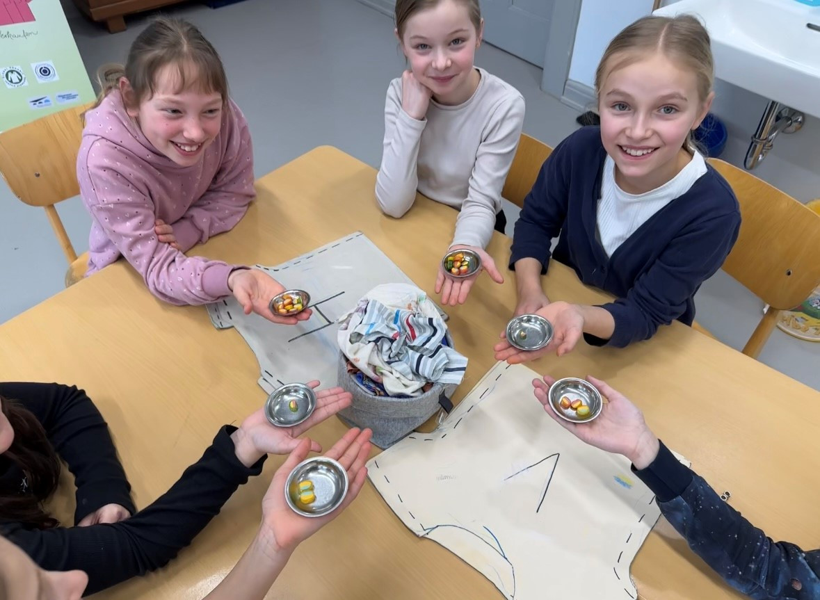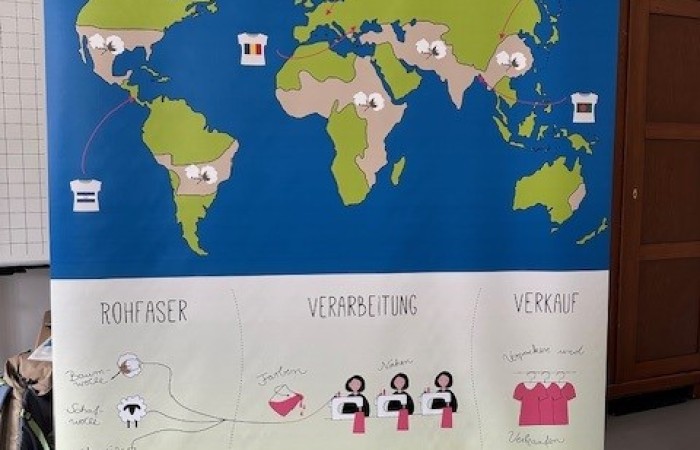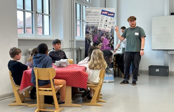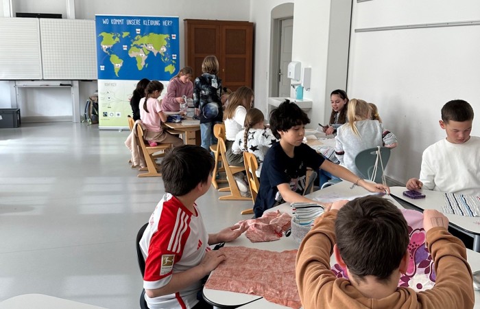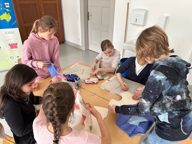 Ziel des Projekts ist es, die Kinder für dieses wichtige Thema zu sensibilisieren und zum selbstständigen und kritischen Denken anzuregen. Die „mobile Textilfabrik“ gab den Schülerinnen und Schüler auf spielerische Art und Weise gezielte Impulse, um über den eigenen Tellerrand hinauszublicken und über die Schere zwischen Arm und Reich zu reflektieren. Nach einer kurzen Einführung zum Thema Baumwolle, in welcher die Kinder ihre Etiketten an den Kleidungsstücken nach der Stoffzusammensetzung und der Herkunft untersuchten, wurden die Kinder dann selbst zu fleißigen Arbeiterinnen und Arbeitern am Fließband in einer fiktiven Fabriksituation. Aus einem Stück Stoff stellten die Schülerinnen und Schüler durch Aufzeichnen, Schneiden, Stecken, Nähen und Bemalen nach und nach ein T-Shirt her. Nach der Gruppenarbeit (“Fließbandarbeit“) wurden die Kinder mit Gummibärchen bezahlt - leider nur sehr ungerecht, je nachdem welches Land ihnen zu Beginn per Los zugeteilt wurde. Das gab Anlass zur Diskussion. Es fielen Sätze, wie: „Total unfair!“ oder „Ich habe genauso viel gearbeitet und bekomme nur ein halbes Gummibärchen!“ Daraufhin erklärten die beiden Mitarbeiter des Politmobils den Kindern, dass es genauso auf der Welt sei. Ein Textilarbeiter aus Bangladesch bekommt für die gleiche Arbeit leider viel weniger. Da die Kinder nun die Ungerechtigkeit am eigenen Leib erlebten, überlegten sie sich daraufhin viele Möglichkeiten, wie sie selbst dazu beitragen können, unfaire Arbeitsbedingungen nicht zu unterstützen. Ideen der Kinder waren dabei, Spenden zu sammeln und Secondhand-Kleidung zu kaufen. Am Ende des Projekts wurde den Kindern gezeigt auf welche Siegel (zum Beispiel: Fairtrade oder Grüner Knopf) sie achten sollten, um beim Kauf von Kleidung faire Arbeitsbedingungen zu berücksichtigen. Sicherlich wird nun das ein oder andere Kind auch daheim nachforschen, ob es diese Siegel in Kleidungsstücken finden kann.