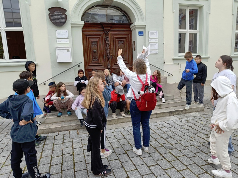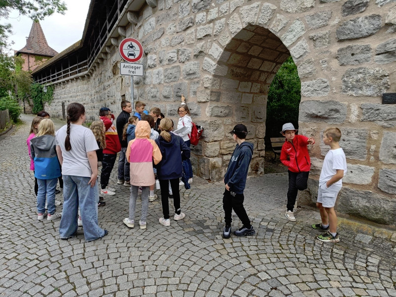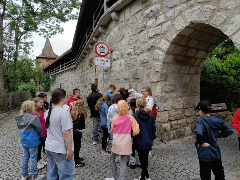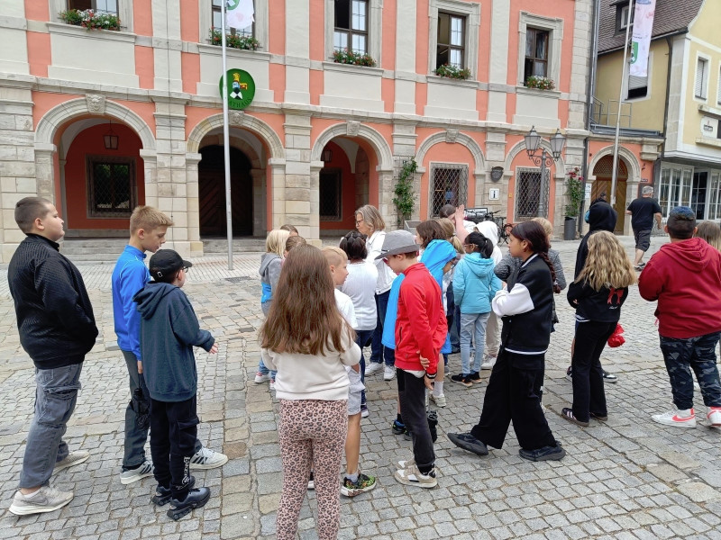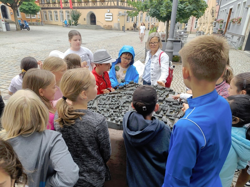 Wir starteten am Alten Schloss, in dem der Markgraf Albrecht Achilles immer nur zwei Wochen im Jahr, nämlich zur Jagdsaison im Juli oder August Hof hielt. Unter dem Schlosshof befinden sich die Ruinen einer noch viel älteren Burg. Danach ging es an der Lateinschule vorbei zur Stadtkirche, auf deren Turm früher immer der Feuerwächter seine Runden drehte. Seit 1557 gibt es unsere Kirchweih. Der Baumeister hat sich mit seinem Kopf am Turm der Kirche verewigt. Es hat etwas gedauert, bis wir ihn gefunden hatten. Dann ging es weiter zum Rathaus, das bereits fünfmal abgebrannt und früher ein markgräfliches Kaufhaus war. Besonders interessant ist, dass das Neustädter Siegel größer als das der Stadt Nürnberg ist. Auf unserem Stadtrundgang erfuhren wir noch viel mehr Geheimnisse. Wir leben in einer Stadt mit vielen tollen Bauten und viel Geschichte!