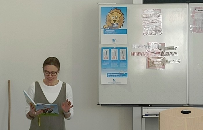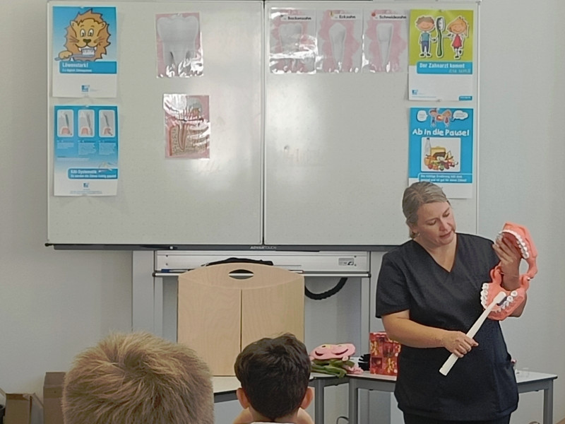 Zusätzlich hatten sie die Möglichkeit, das richtige Zähneputzen zu erlernen bzw. zu wiederholen. Durch das KAI-Prinzip (Kauflächen, Außenflächen, Innenflächen) wurden sie dazu angeleitet, ihre Zähne gründlich zu pflegen. Ein interaktives Spiel half außerdem dabei, die verschiedenen Teile eines Zahnes kennenzulernen.