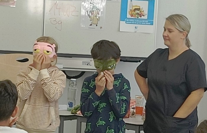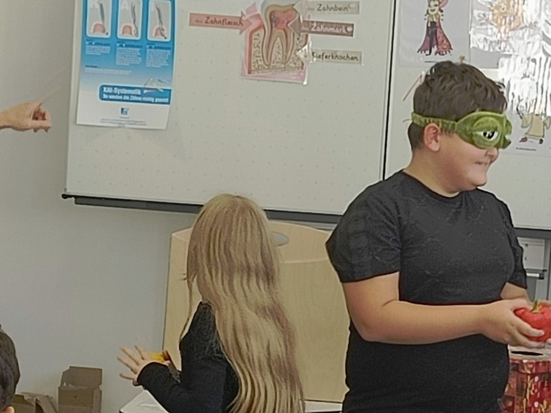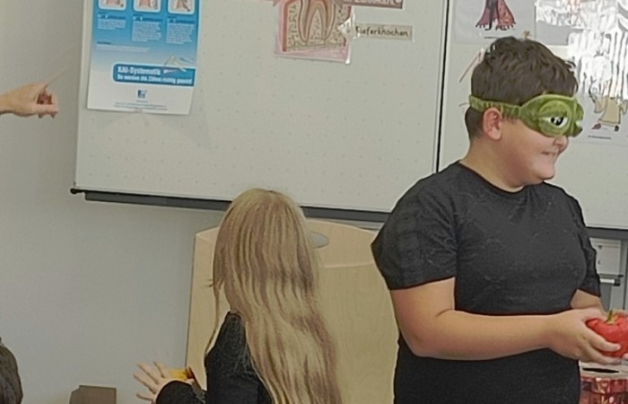 Besonders wichtig war auch die Diskussion über essenzielle Nährstoffe für die kalte Jahreszeit. Sie erfuhren, dass Vitamin D, Vitamin C und Zink wichtige Bestandteile einer gesunden Ernährung sind und durften diese Superkräfte in einem Fühlspiel in Obst und Gemüse erspüren.