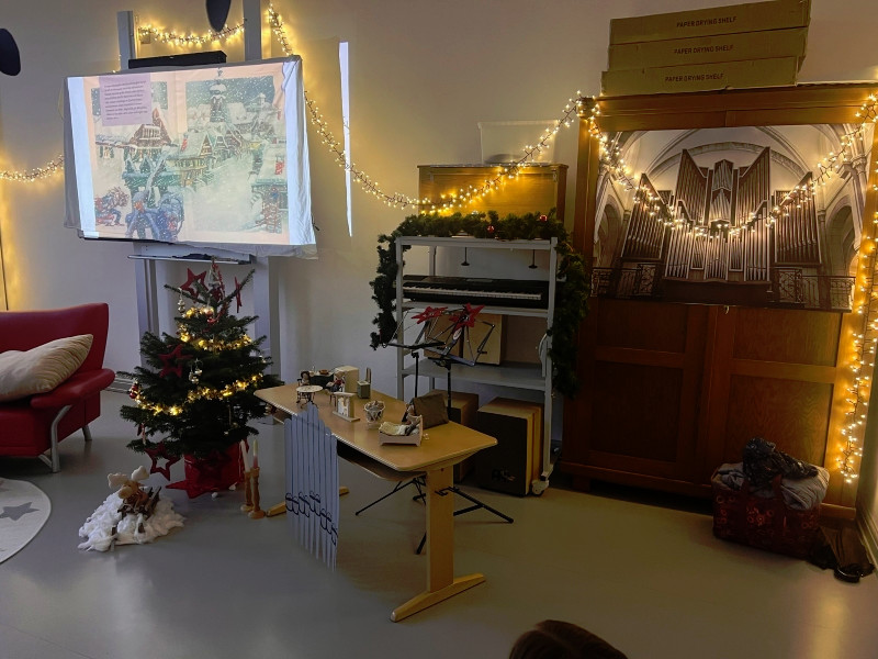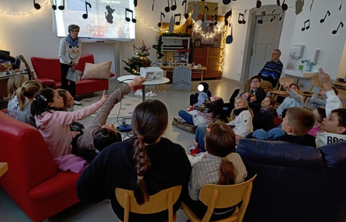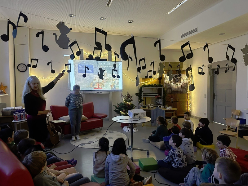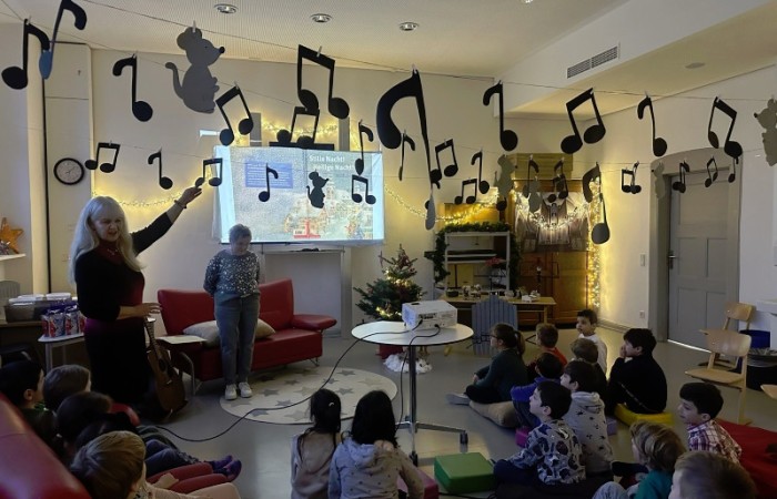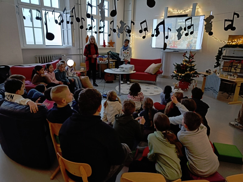 Eine „Stube“ in der eine Weihnachtsgeschichte der besonderen Art vorgelesen wird. Eingerichtet und dekoriert wurde diese Stube vom Elternbeirat. Dieses Jahr wurden alle Klassen der Grundschule in die Schulbücherei eingeladen. Der Raum war sehr liebevoll, weihnachtlich und passend zu dem Bilderbuch „Stille Nacht! Heilige Nacht!” dekoriert worden. Das Buch erzählt die Entstehungsgeschichte des wohl weltweit bekanntesten Weihnachtsliedes. Es gab 13 verschiedene Vorleser, wie beispielsweise ehemalige Kolleginnen der Grundschule, der Bürgermeister, Vertreter des Stadtrats und der Stadt, eine Polizistin und eine Vertreterin des Elternbeirats.